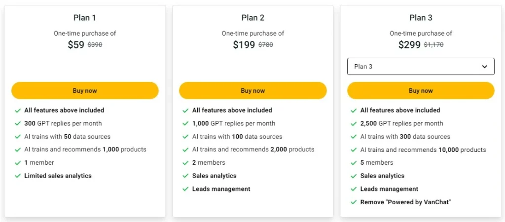 VanChat offers a range of pricing plans that cater to different needs. The lifetime deal provides significant savings compared to regular pricing. Below, we delve into the cost details and compare them with the standard rates.