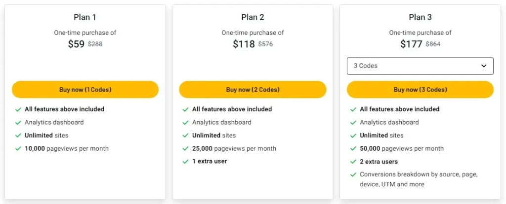| Plan 3 | $177 | Lifetime access, Unlimited sites, 50,000 pageviews/month, 2 extra users, Conversions breakdown by source, page, device, UTM |
